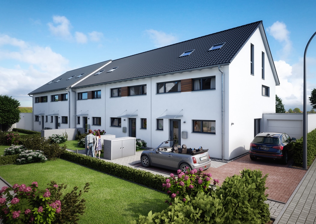 Es entstanden vier Reihenhäuser, höhenversetzt, mit zwei Vollgeschossen und Pultdach samt großen Dachterrassen mit unverbaubarem Blick in das schöne Paartal.
