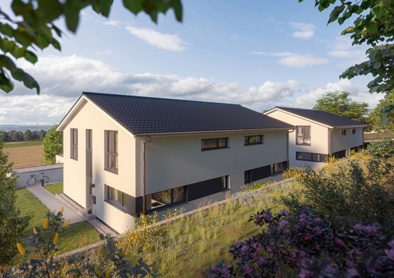 Die in ökologischer Holzständerbauweise errichteten Gebäude in Hanglage sind ausgestattet mit Luft-Wasser-Wärmepumpen und zentralen Lüftungsanlagen in geförderter KfW40-Bauweise.